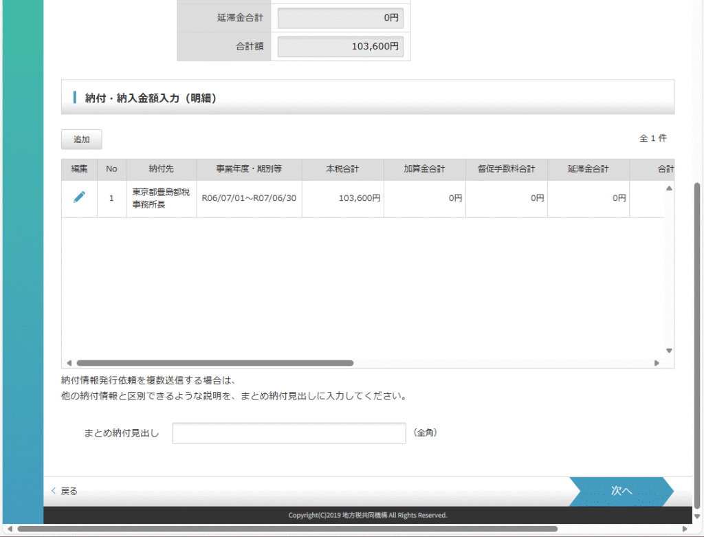 「地方公共団体」や「区・事務所等」を選択し、「納付・納入金額入力」をクリック