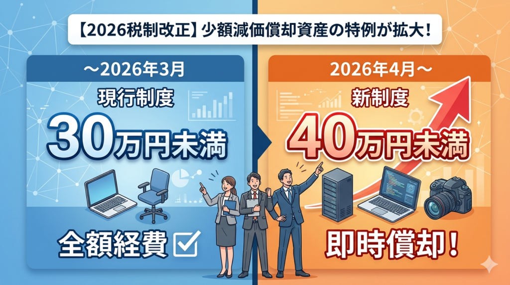最大の変更点は、一括で経費(損金)に算入できる資産の取得価額が、30万円未満から40万円未満に引き上げられることです。